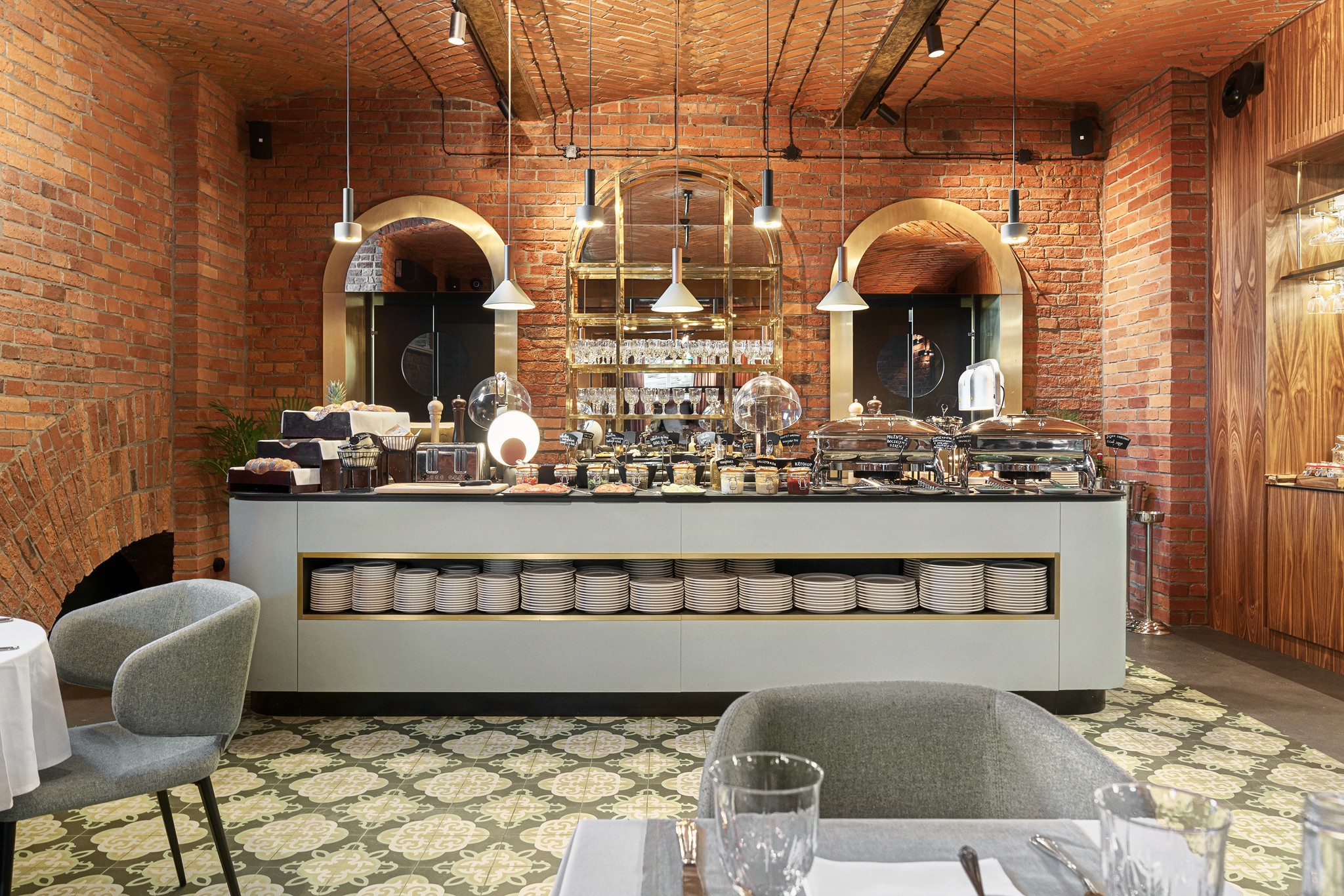 Zupełnie inny klimat ma hotelowa restauracja, zaaranżowana w podziemiach budynku. Ceglane ściany, łukowe sklepienia i cementowa wzorzysta posadzka na długo pozostają w pamięci gości.