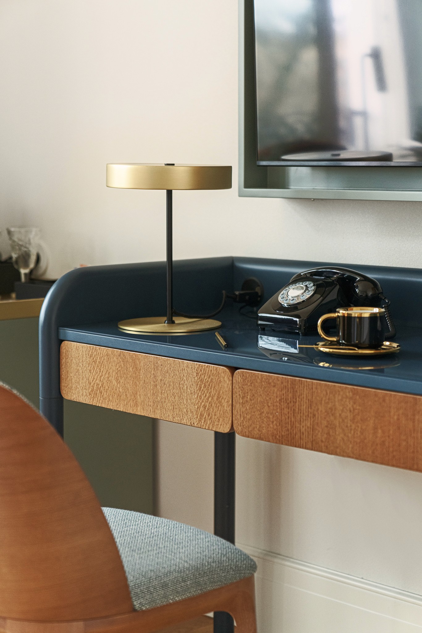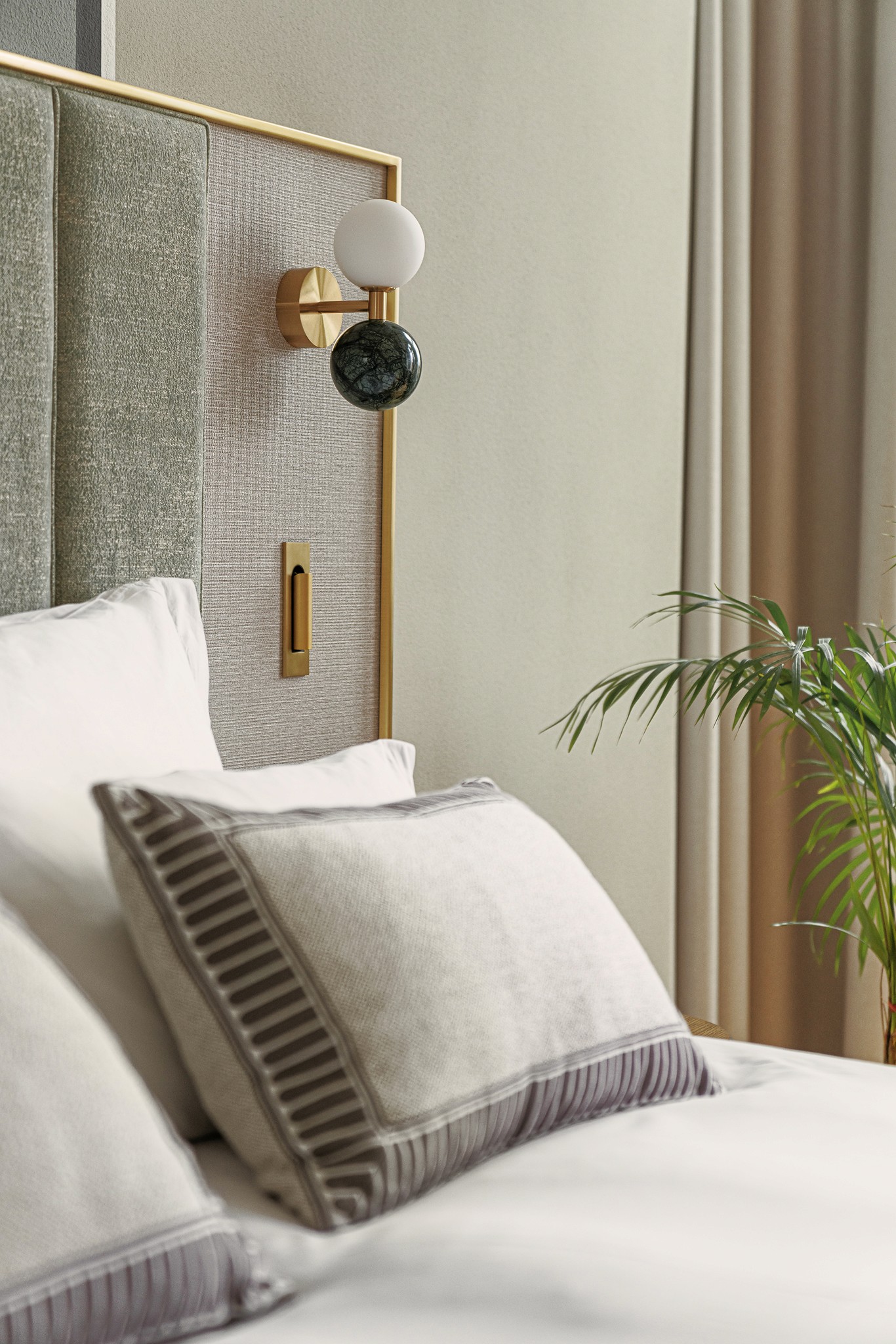 Szerokie tapicerowane zagłowie łóżka stoi na tle ściany z dekoracyjnym motywem łuków, który przewija się w różnych strefach hotelu. We wszystkich pokojach postawiliśmy na parkiet dębowy. Stonowaną ciepłą kolorystykę ożywiają nowoczesne meble i geometryczny dywan w intensywnych kolorach.