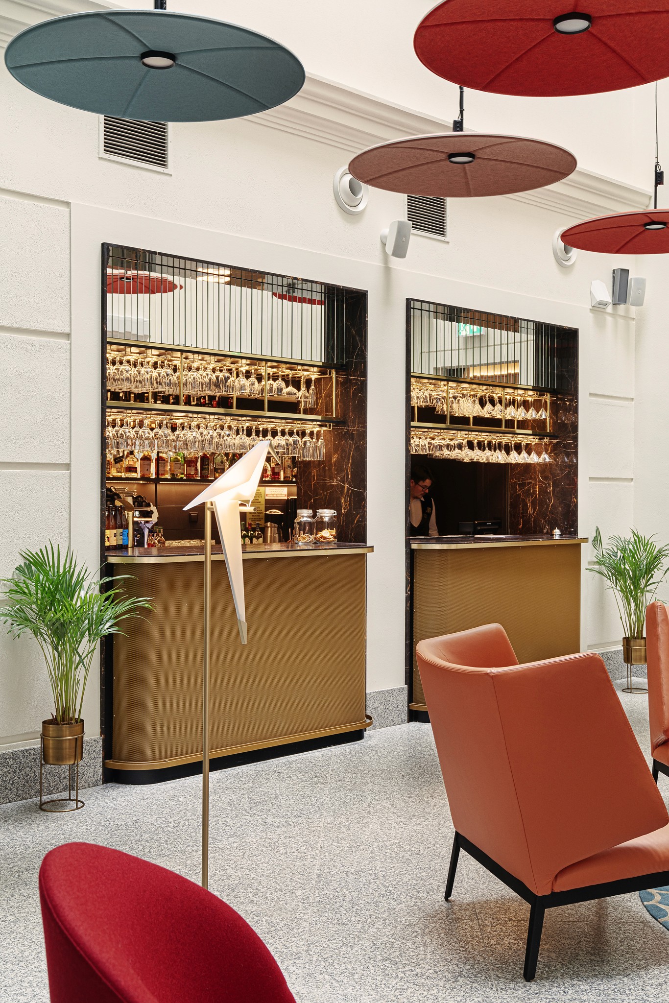 Hotelowy bar został zaaranżowany w patio, powstałym na dawnym dziedzińcu pomiędzy budynkiem pałacu a dwiema kamienicami. Dzięki szklanemu zadaszeniu przestrzeń jest niezwykle jasna. Dużym wyzwaniem była akustyka w tej przestrzeni, ponieważ część hotelowych okien wychodzi właśnie na dziedziniec. Duże okrągłe filcowe lampy w różnych kolorach zostały zwieszone na poziomie pierwszego pietra tworząc niejako zadaszenie pochłaniające hałas. Wieczorem nastrojowe oświetlenie dodaje przytulności.