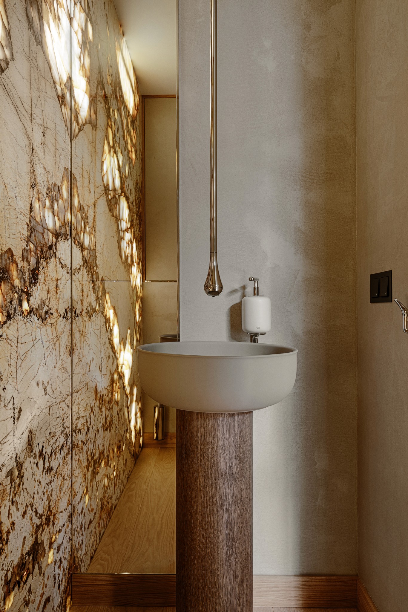 Tło tworzy ściana dekoracyjna z podświetlanego marmuru Patagonia. Ciepłe światło przenikające przez półprzezroczyste fragmenty kamienia wydobywa naturalne piękno struktury i nadaje wnętrzu biżuteryjny charakter.