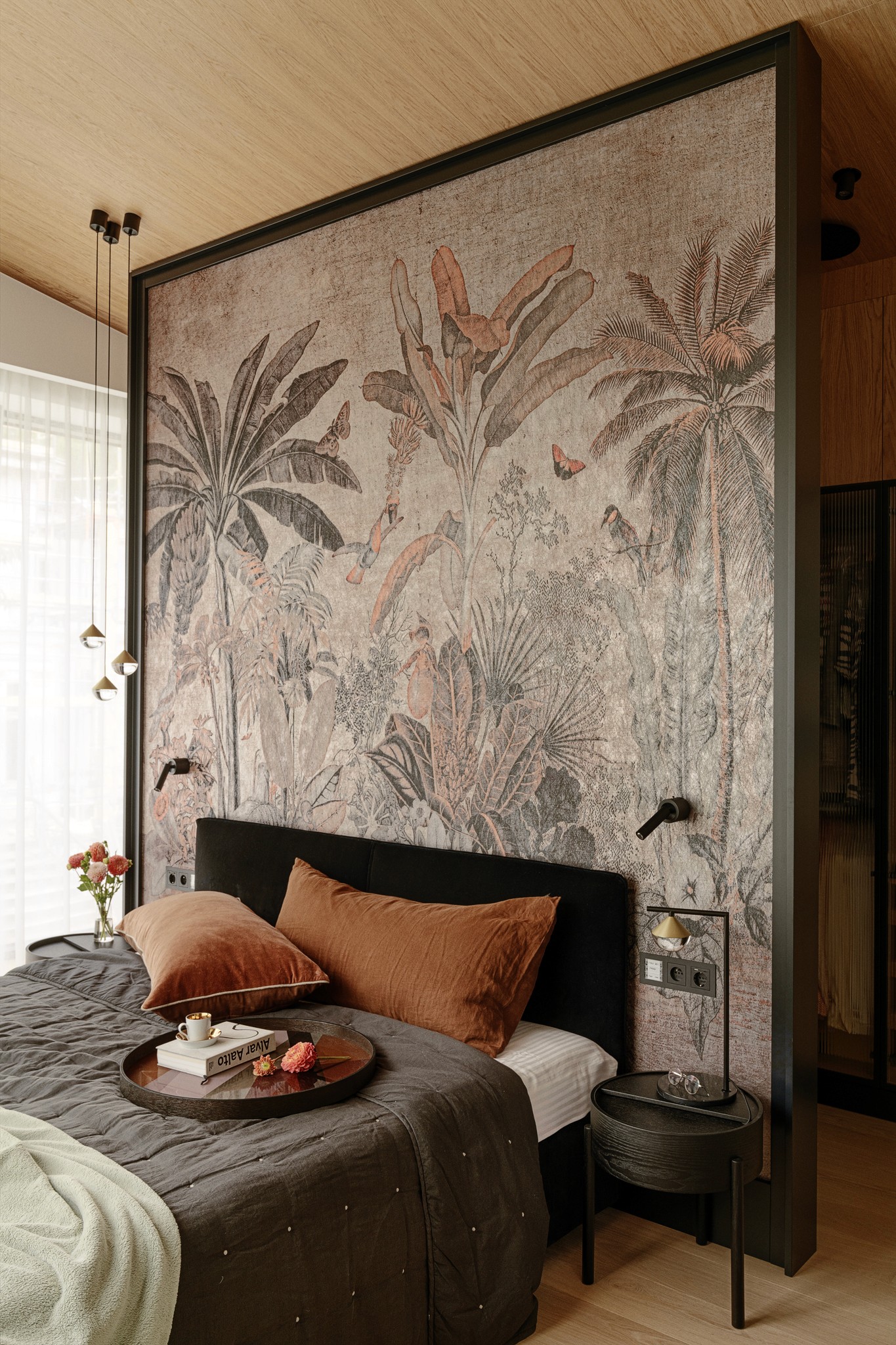 Sypialnia w sopockim domu została zaprojektowana w wyrazistej palecie ciepłych brązów, które podkreślają jej nowoczesny, a zarazem przytulny charakter. Uwagę przykuwa przede wszystkim tapeta za wezgłowiem łóżka, dodająca głębi i dekoracyjnego rytmu przestrzeni. To wnętrze, które łączy komfort codzienności z ponadczasowym designem.