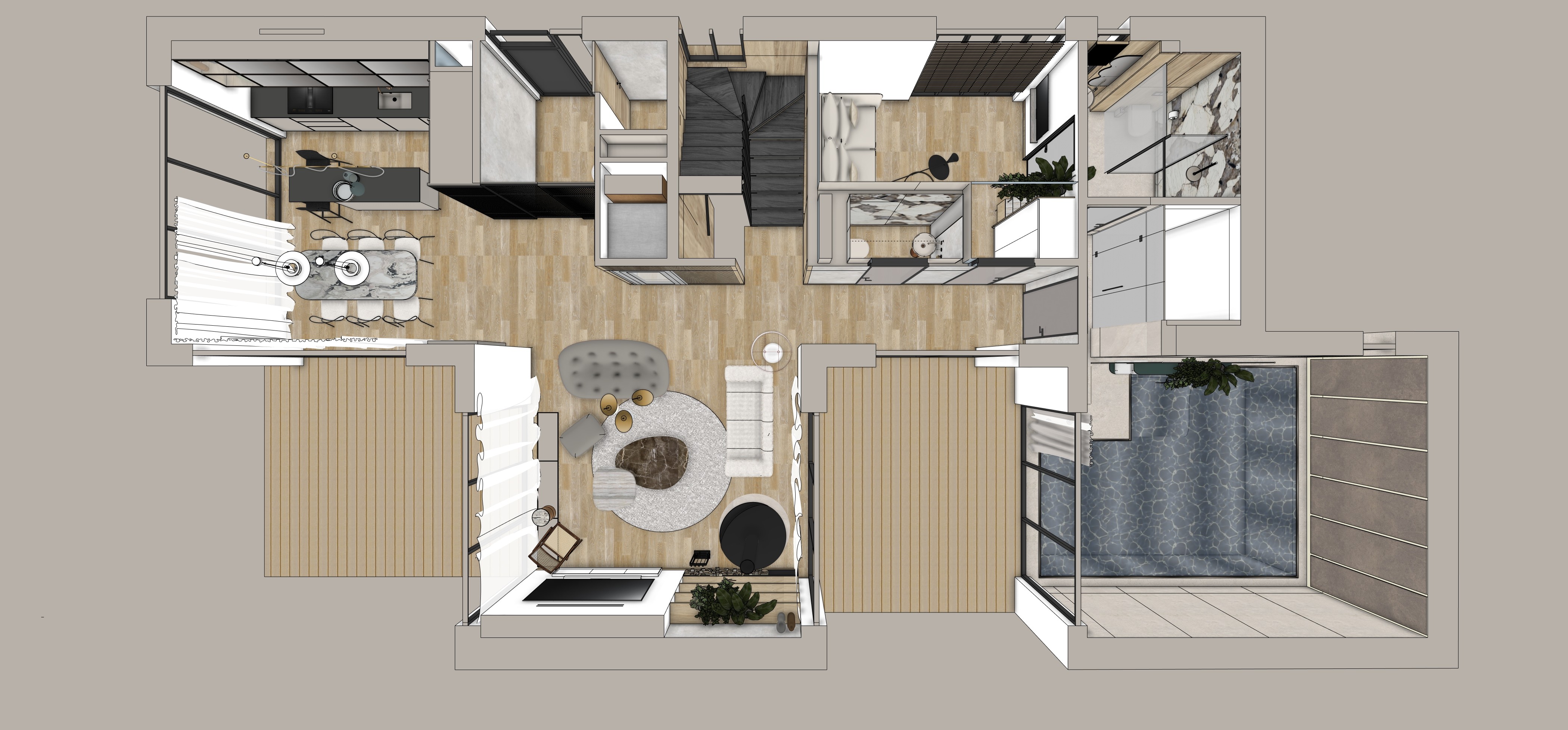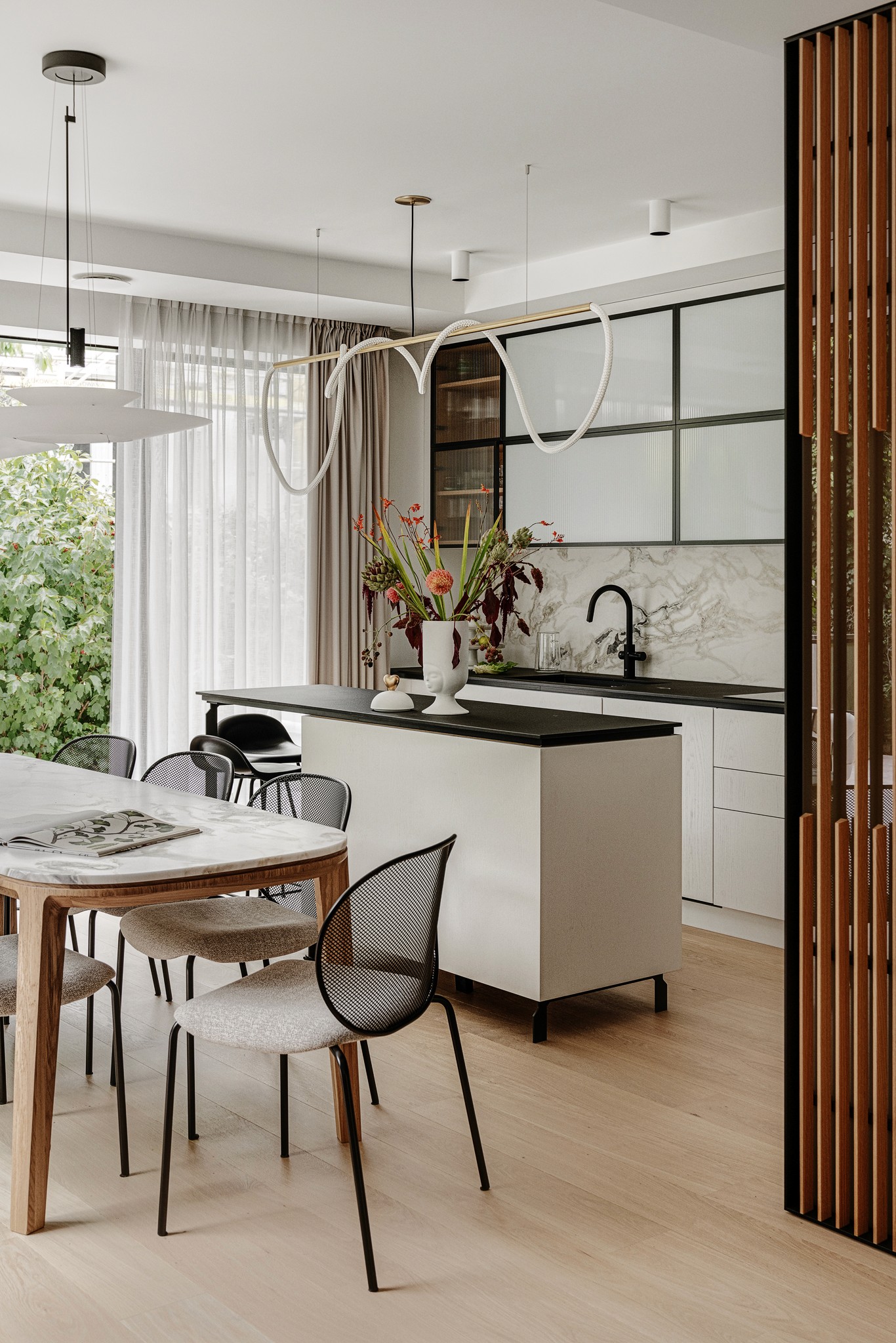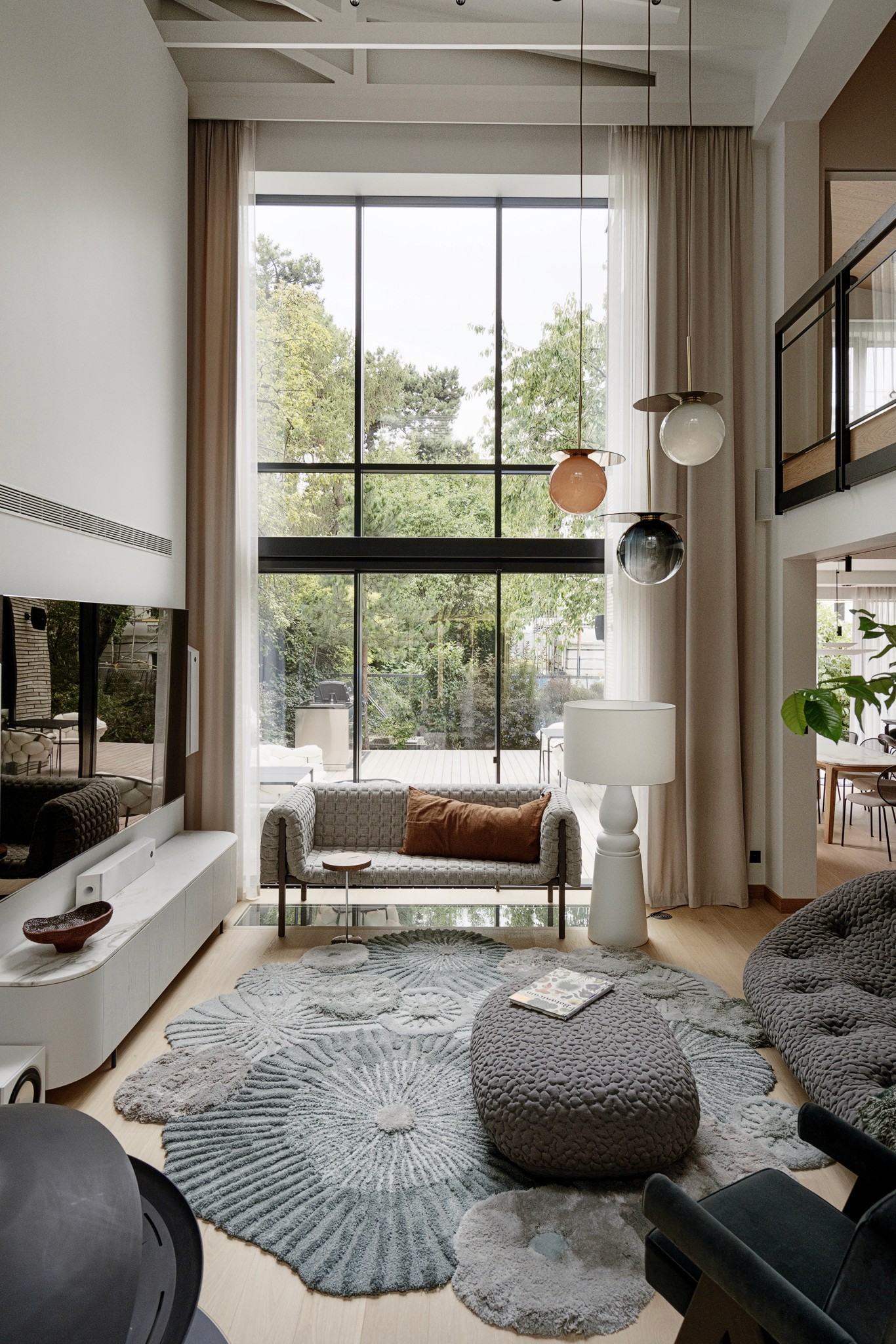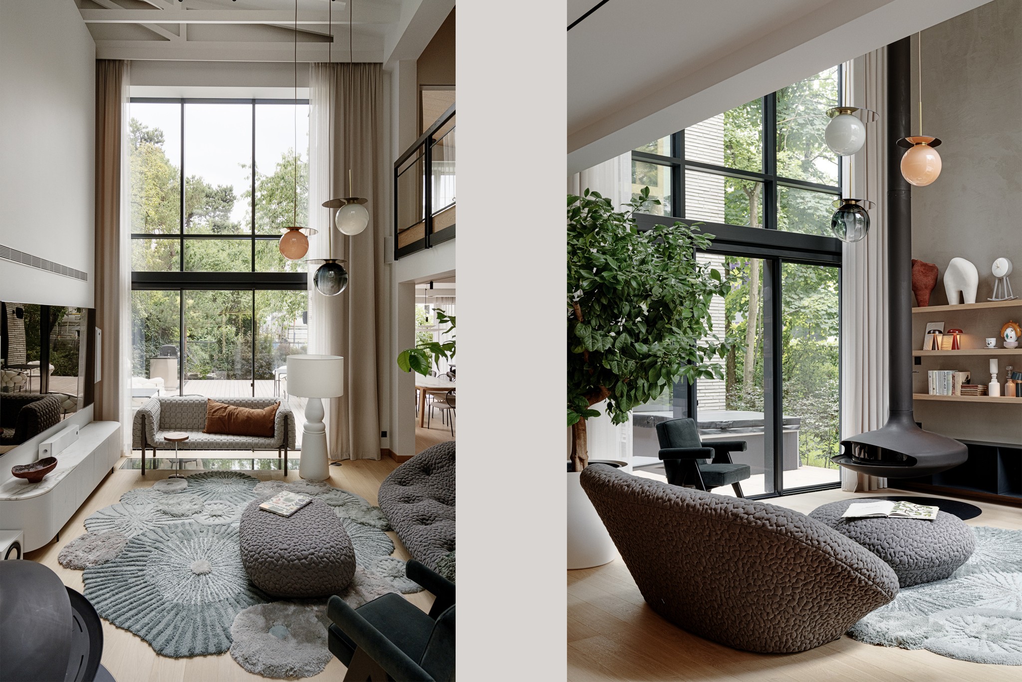 Eleganckie, a jednocześnie przytulne wnętrze budują ikony designu: organiczna sofa z tapicerowanym podnóżkiem, lampy z dmuchanego szkła, ponadczasowy fotel, wiszący kominek oraz trójwymiarowy dywan. To przestrzeń, w której nowoczesność harmonijnie współgra z ciepłem domowej atmosfery.