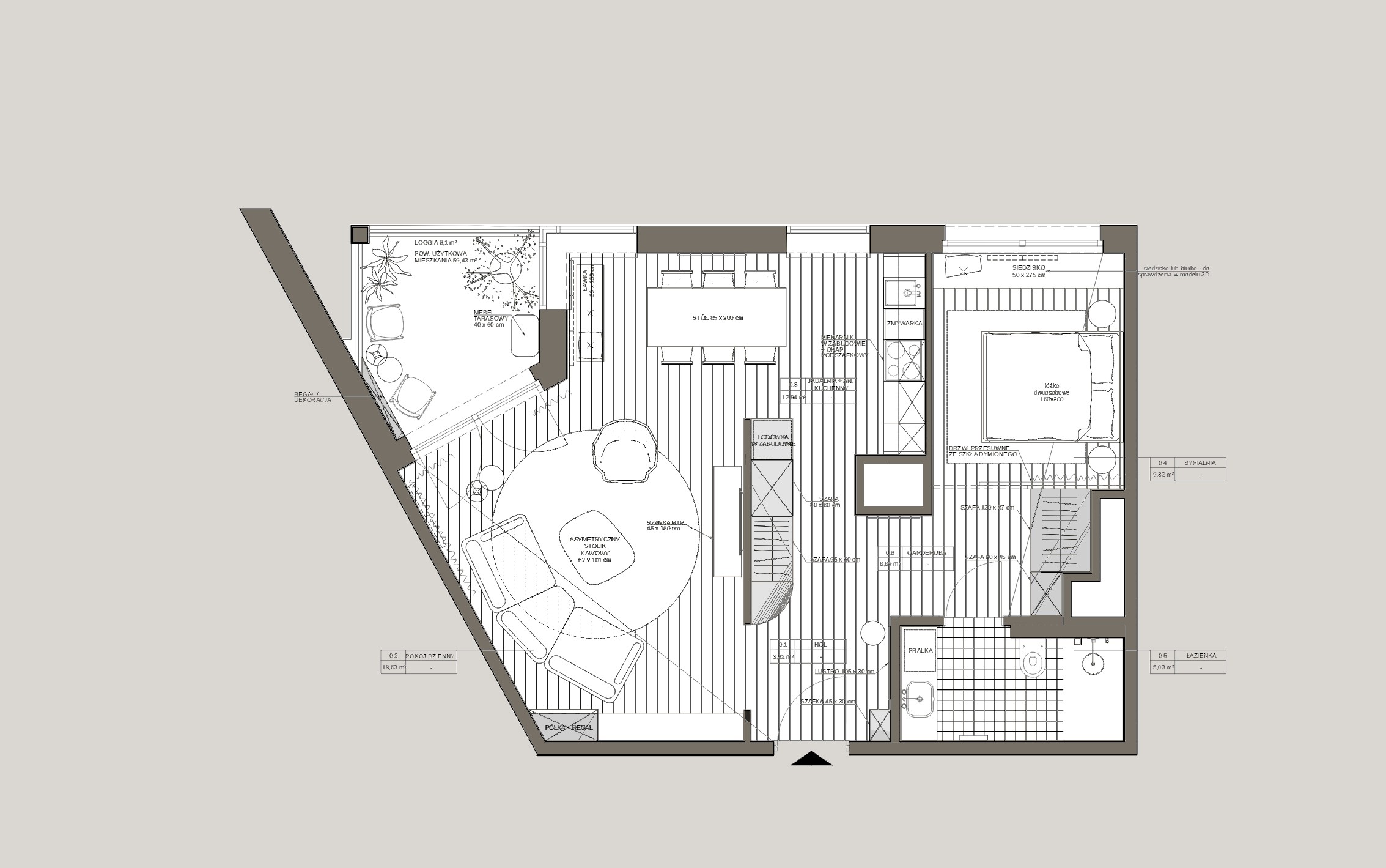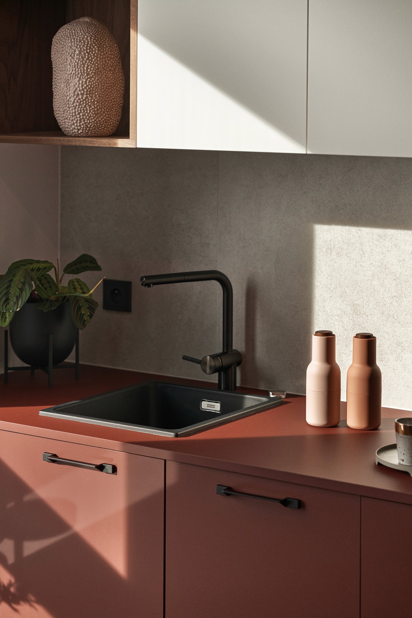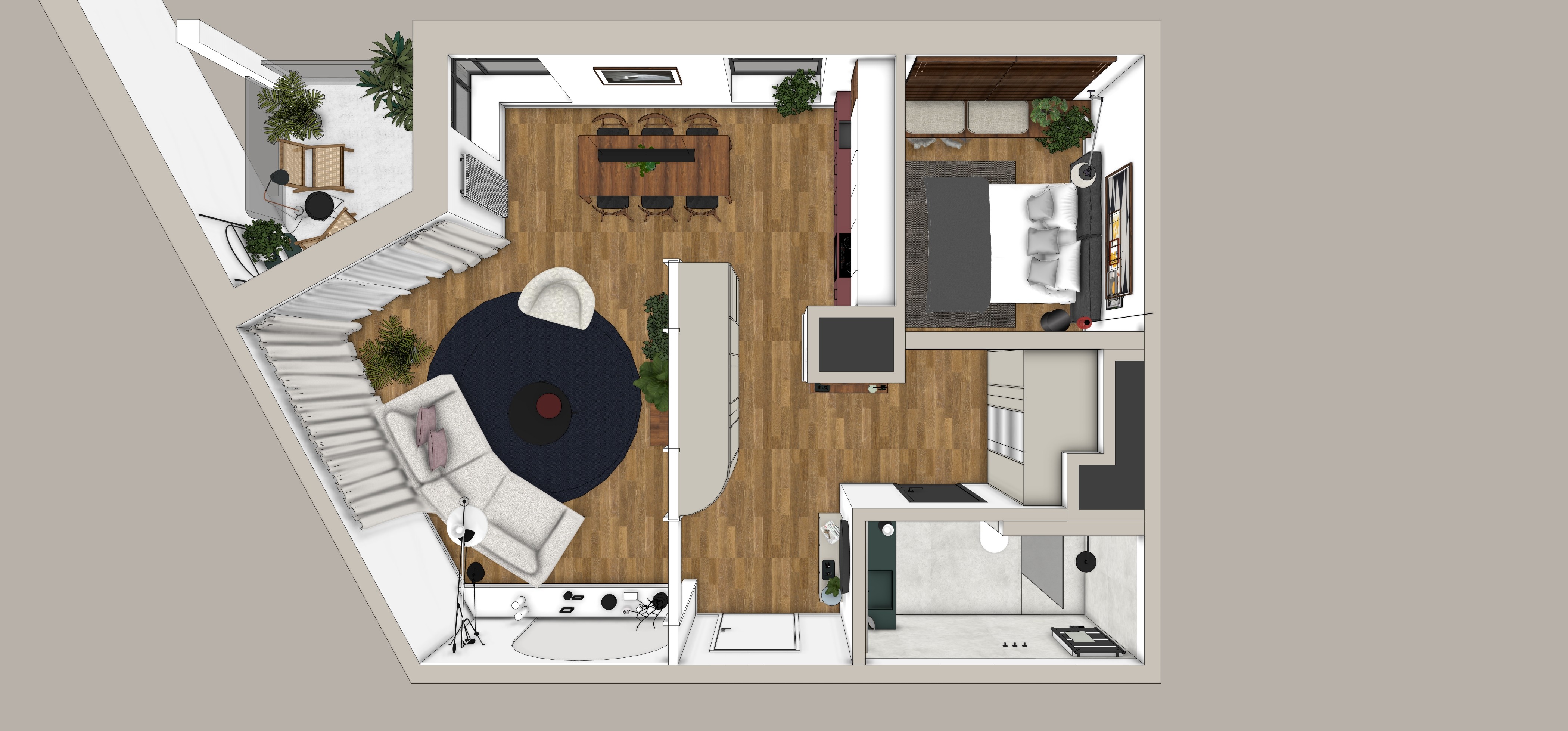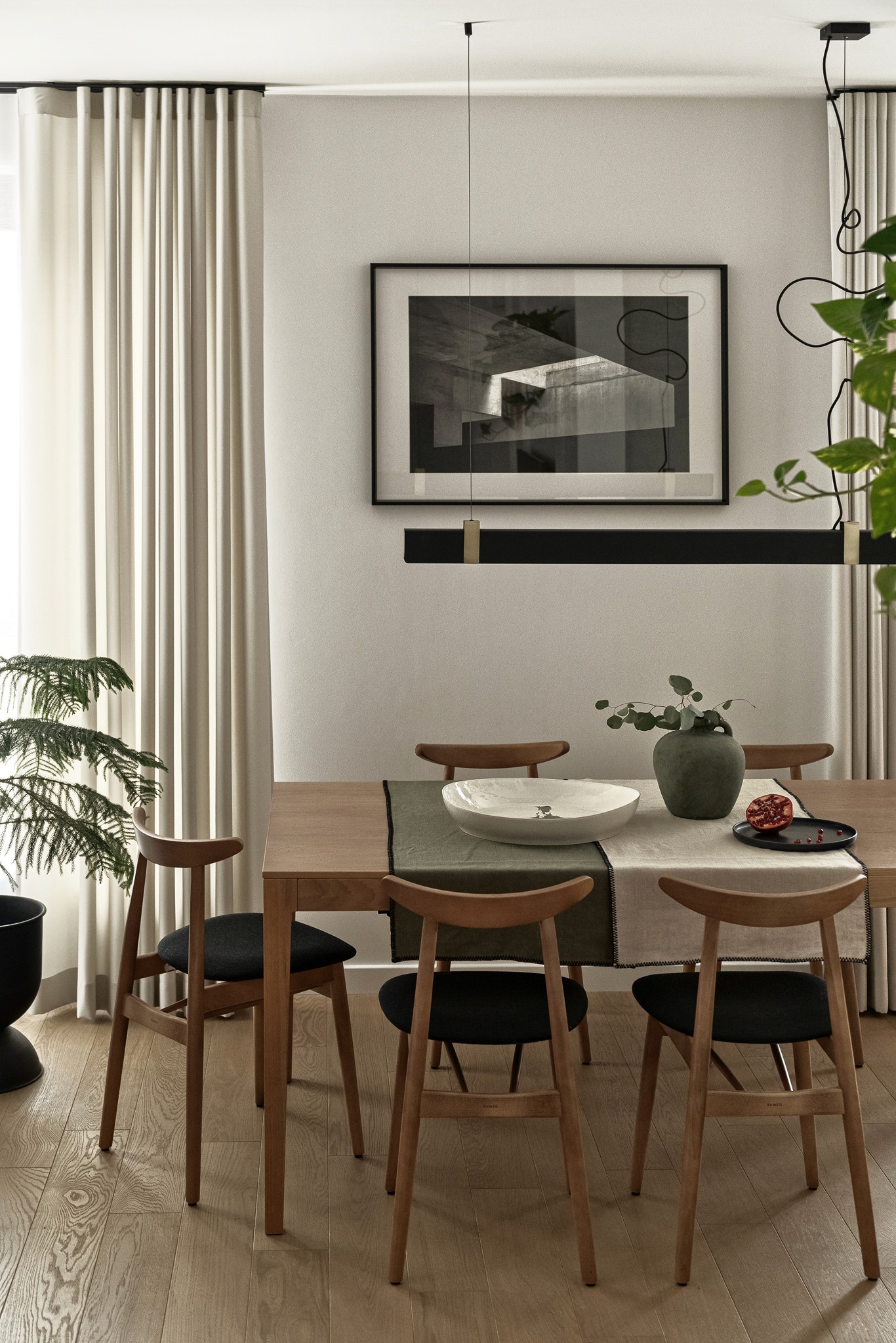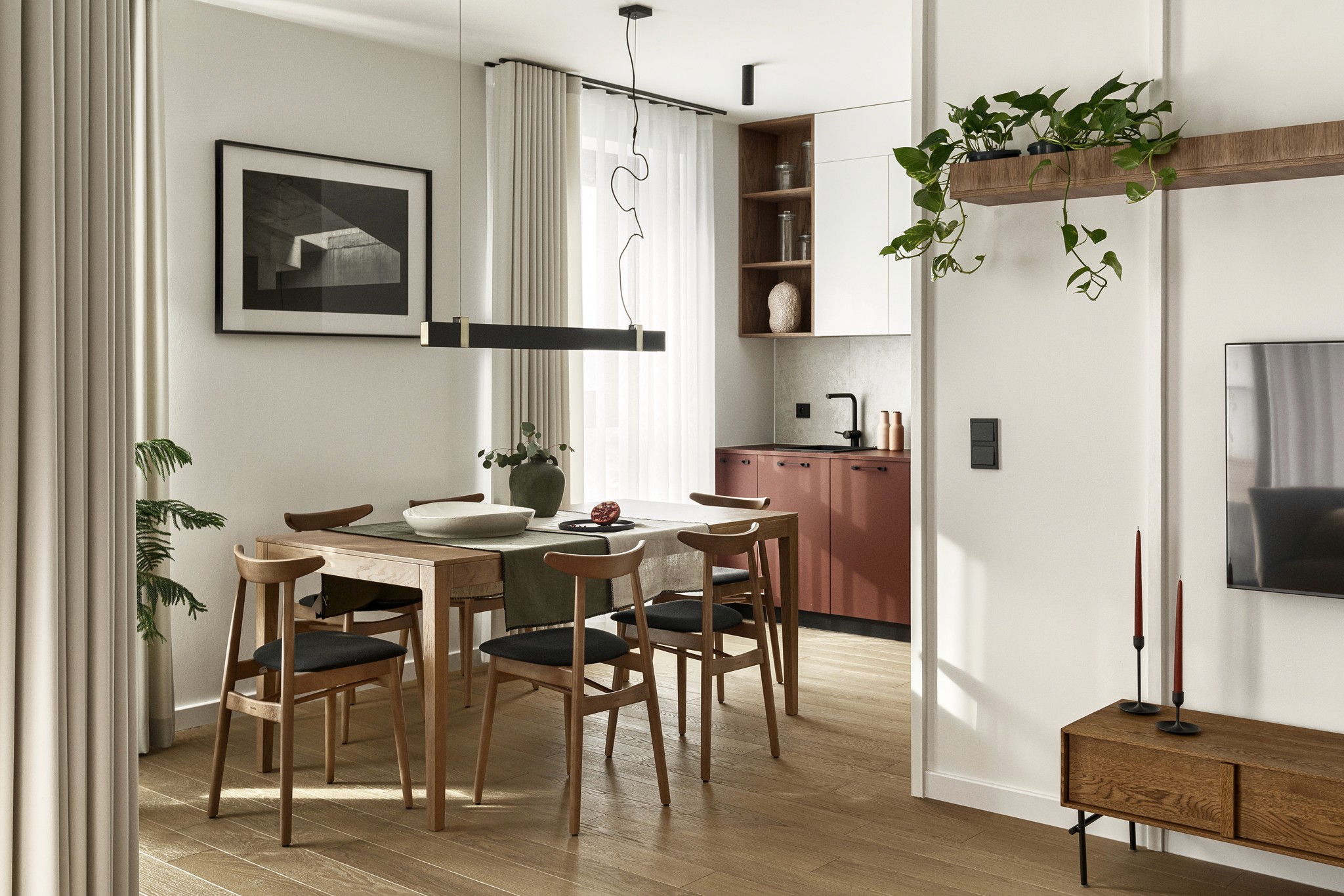 Stonowana baza przełamana wyrazistym akcentem kolorystycznym w postaci otwartej kuchni, tworzy przestrzeń, która jest jednocześnie spokojna i pełna charakteru.
