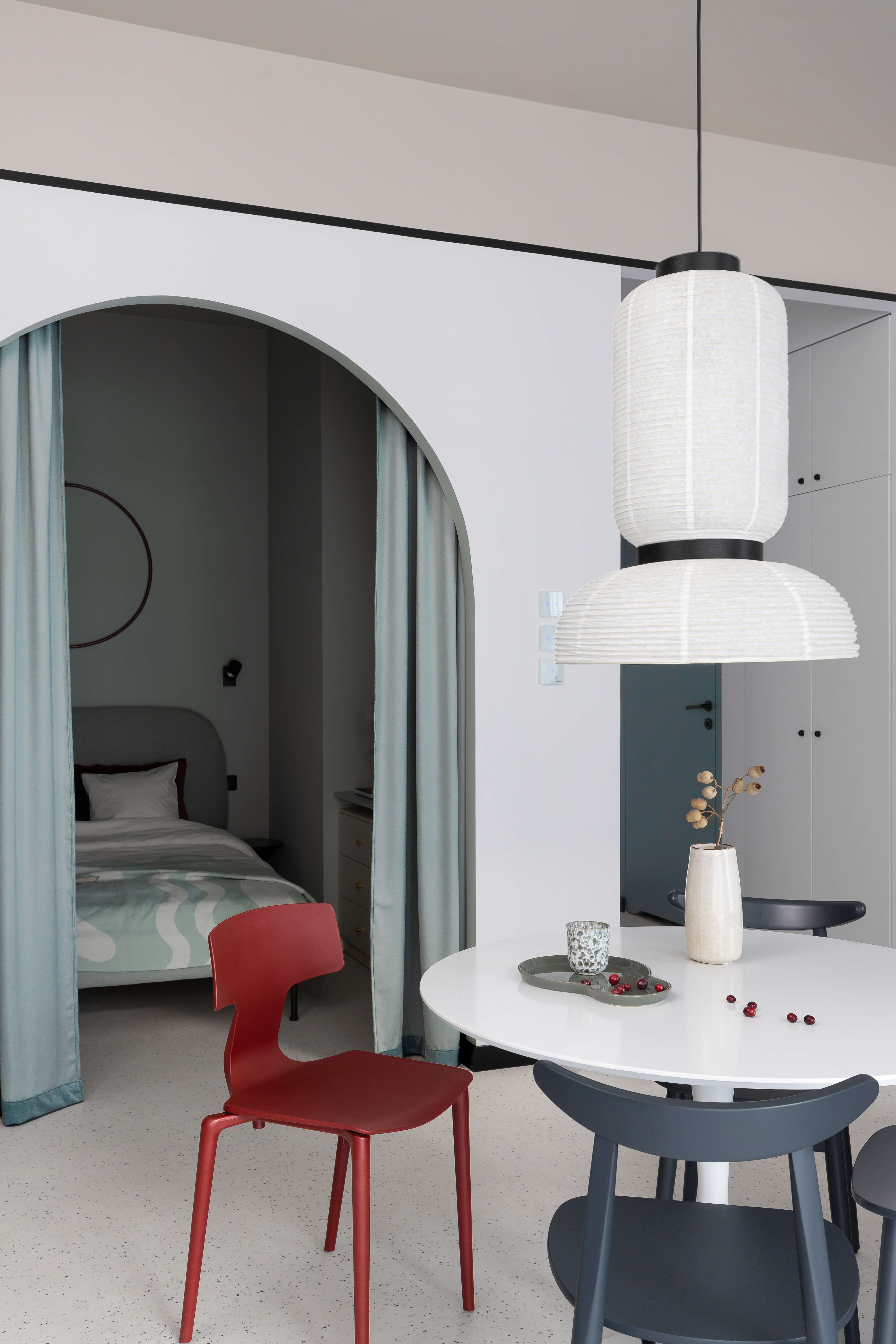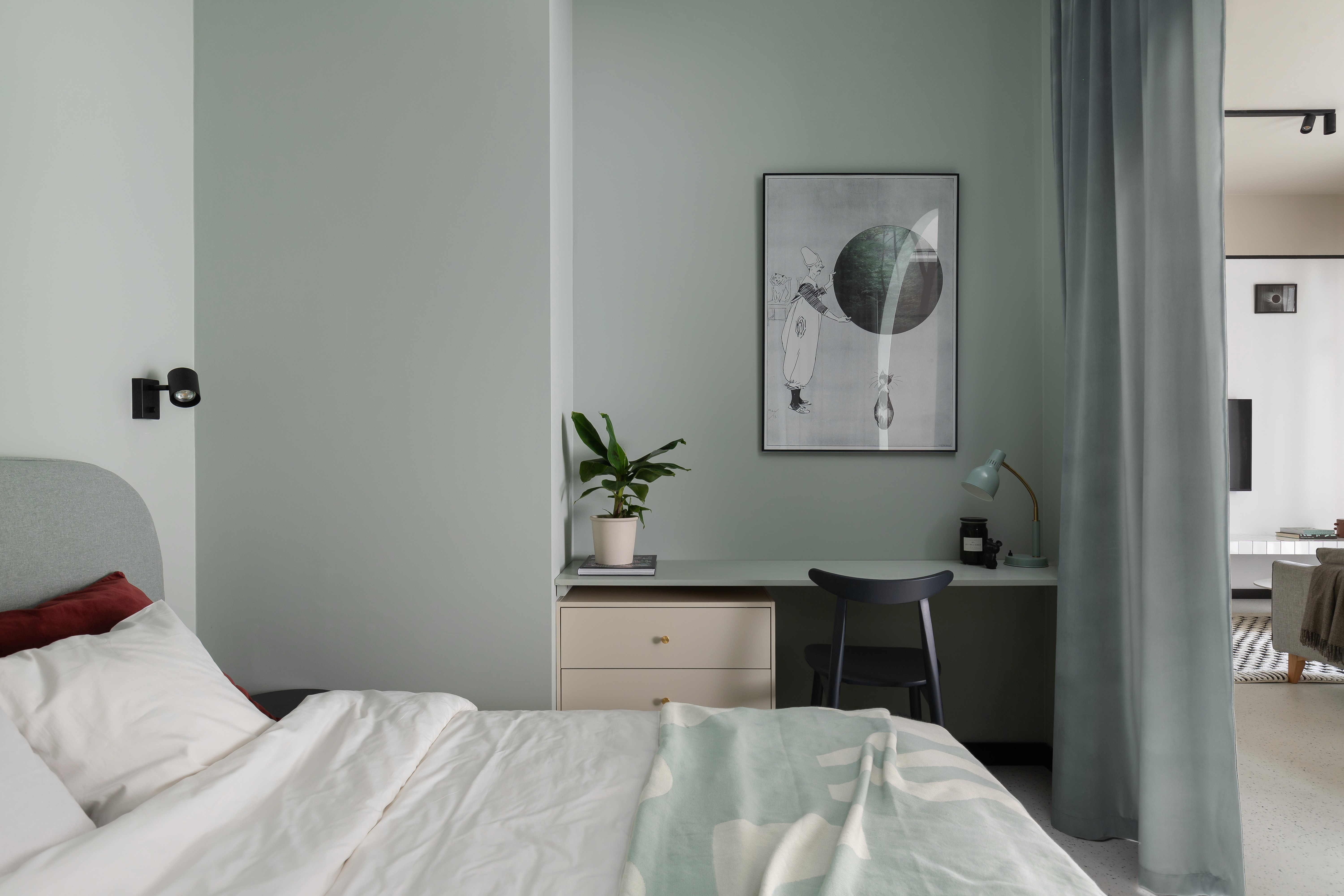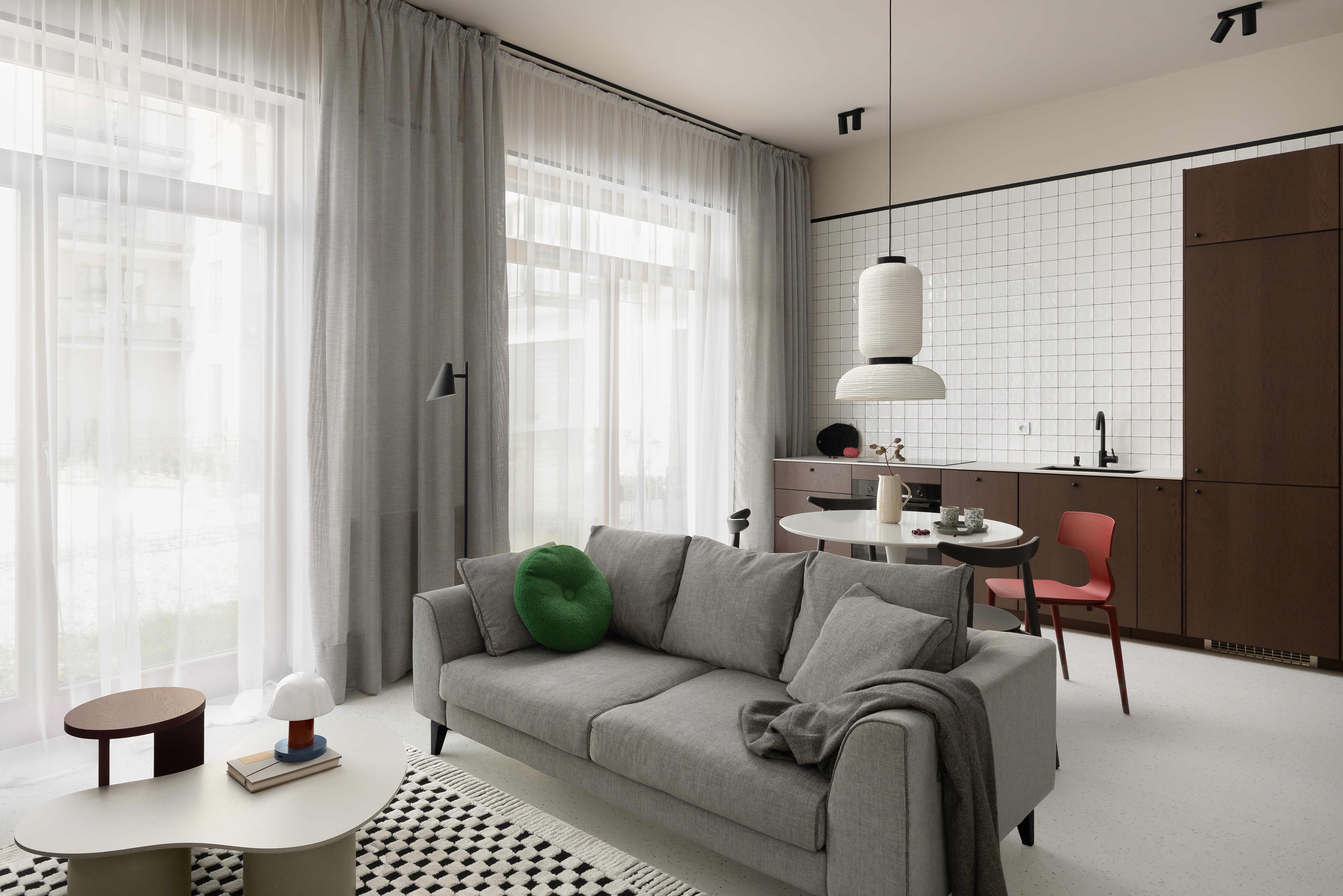 W tym niewielkim 42 metrowym mieszkaniu całkowicie otworzyliśmy przestrzeń, by uzyskać wrażenie jak największej przestronności. Salon został połączony z kuchnią, co pozwoliło na uzyskanie dużego pomieszczenia o powierzchni aż 27 m2. To w połączeniu z ponadstandardową wysokości 3,2 m daje w tym mieszkaniu niesamowite wrażenie. Sypialnia została „schowana” w przytulnej przestrzeni w odcieniach chłodnej zieleni.