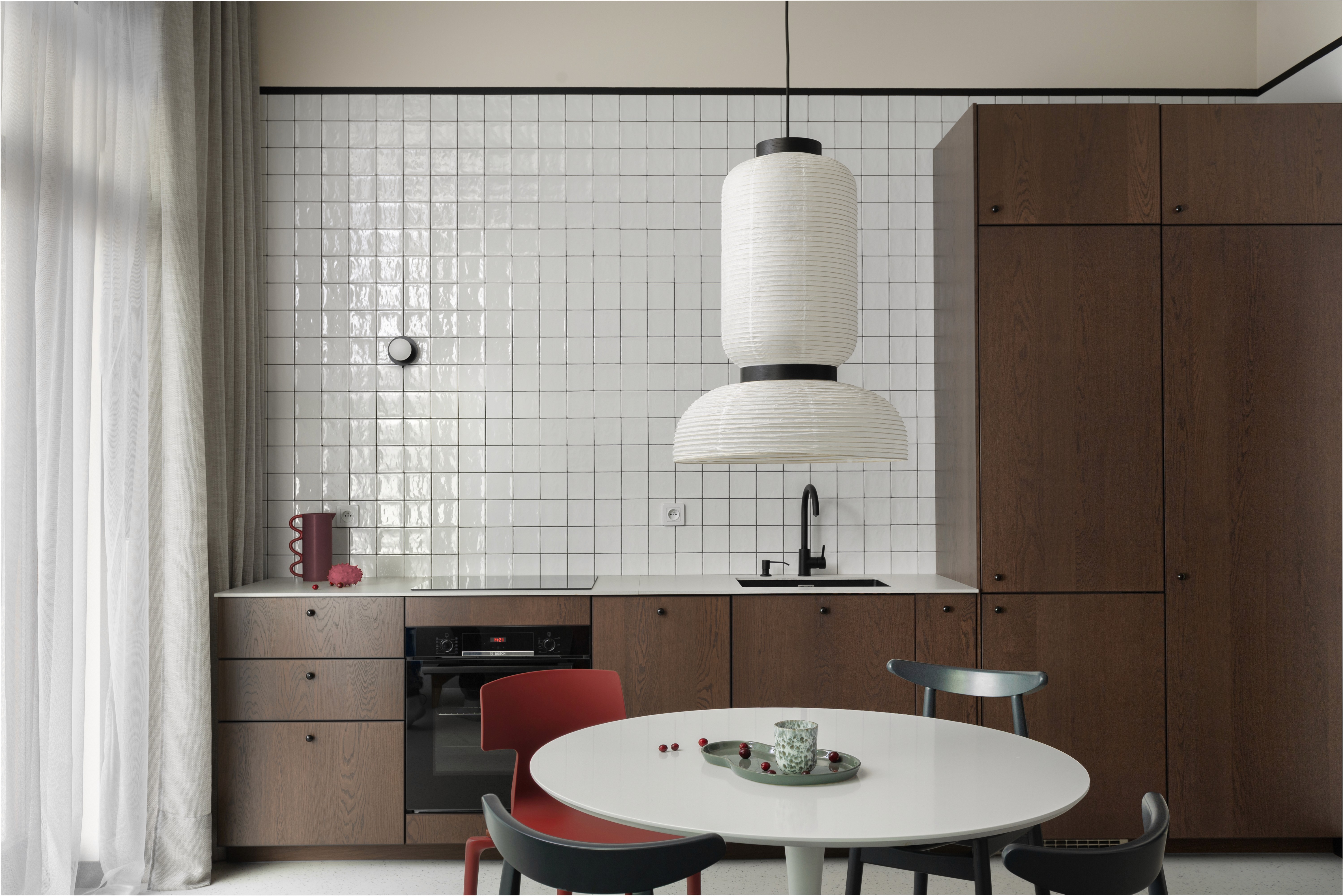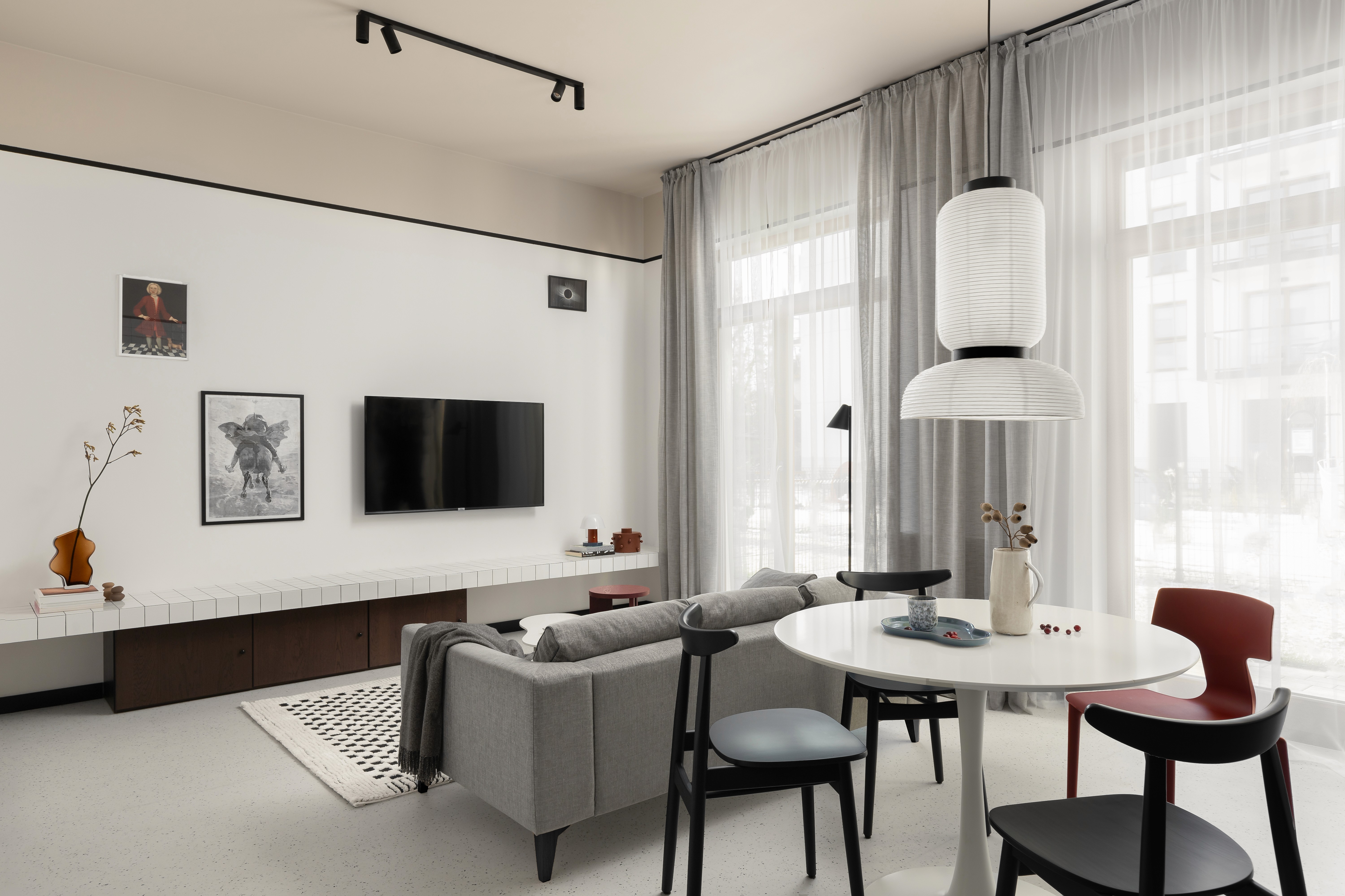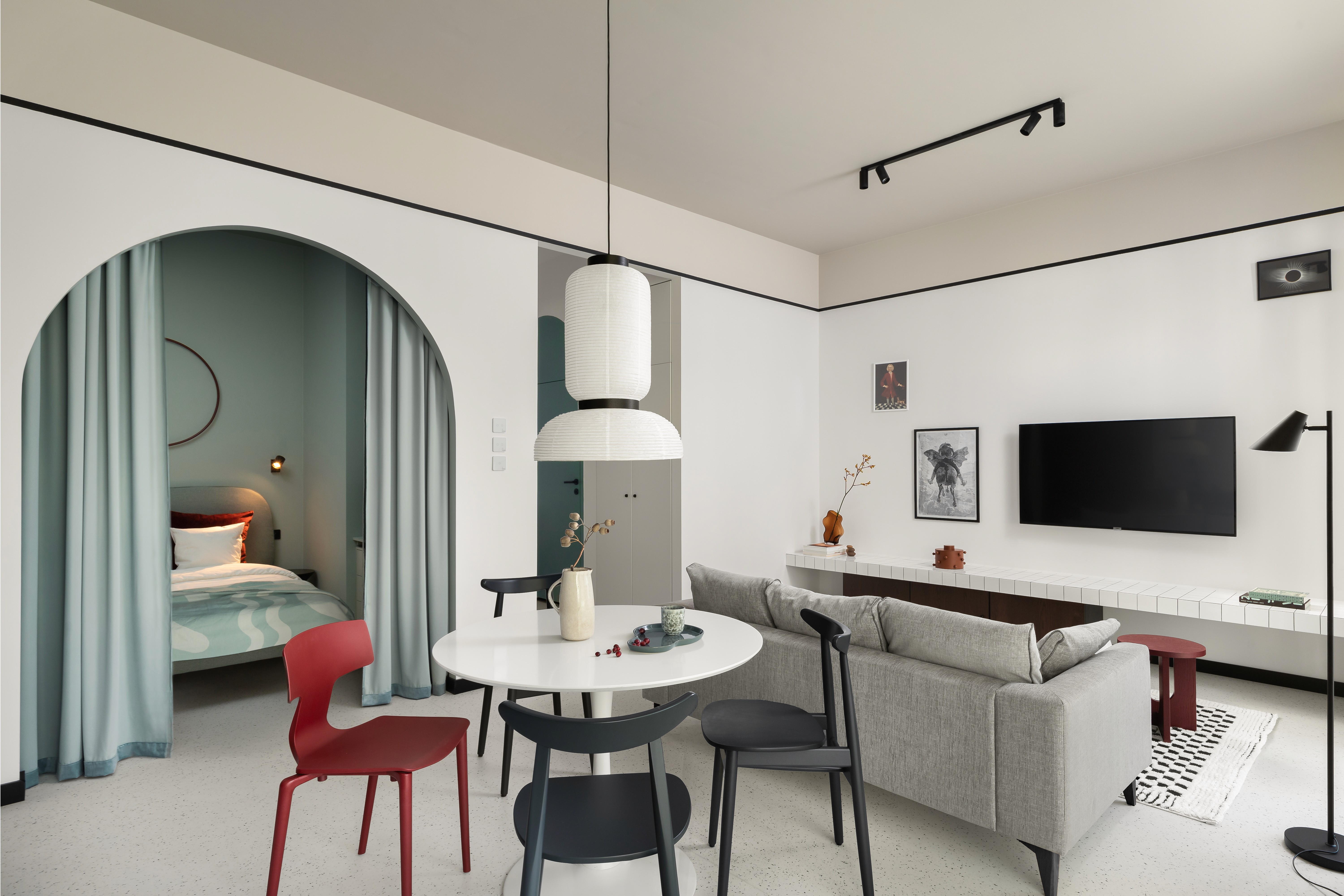 W tym niewielkim 42 metrowym mieszkaniu całkowicie otworzyliśmy przestrzeń, by uzyskać wrażenie jak największej przestronności. Salon został połączony z kuchnią, co pozwoliło na uzyskanie dużego pomieszczenia o powierzchni aż 27 m2. To w połączeniu z ponadstandardową wysokości 3,2 m daje w tym mieszkaniu niesamowite wrażenie. Sypialnia została „schowana” w przytulnej przestrzeni w odcieniach chłodnej zieleni.