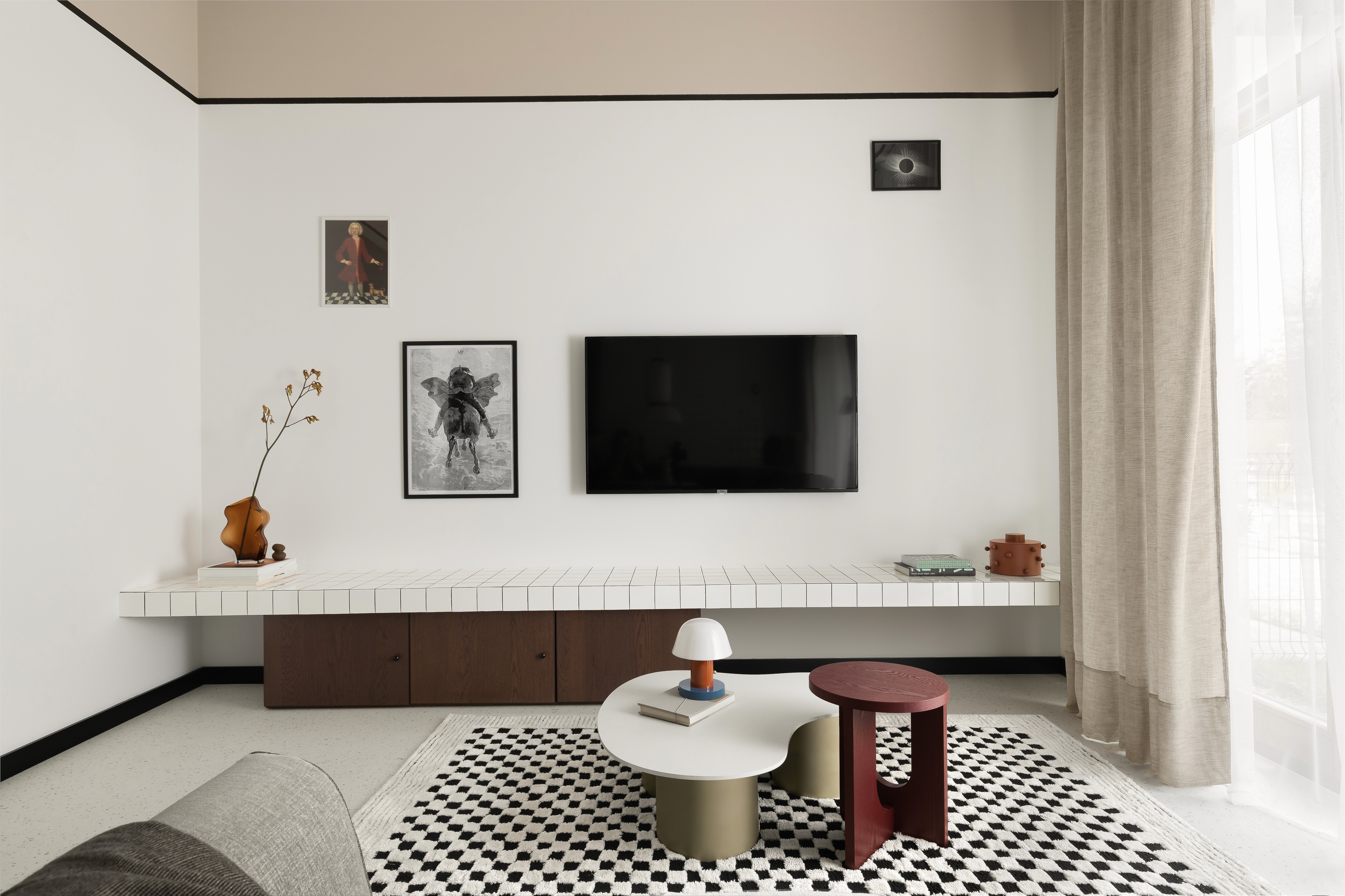 Jasna podłoga stanowi doskonałe tło dla licznych akcentów kolorystycznych i równoważy beżowy sufit.