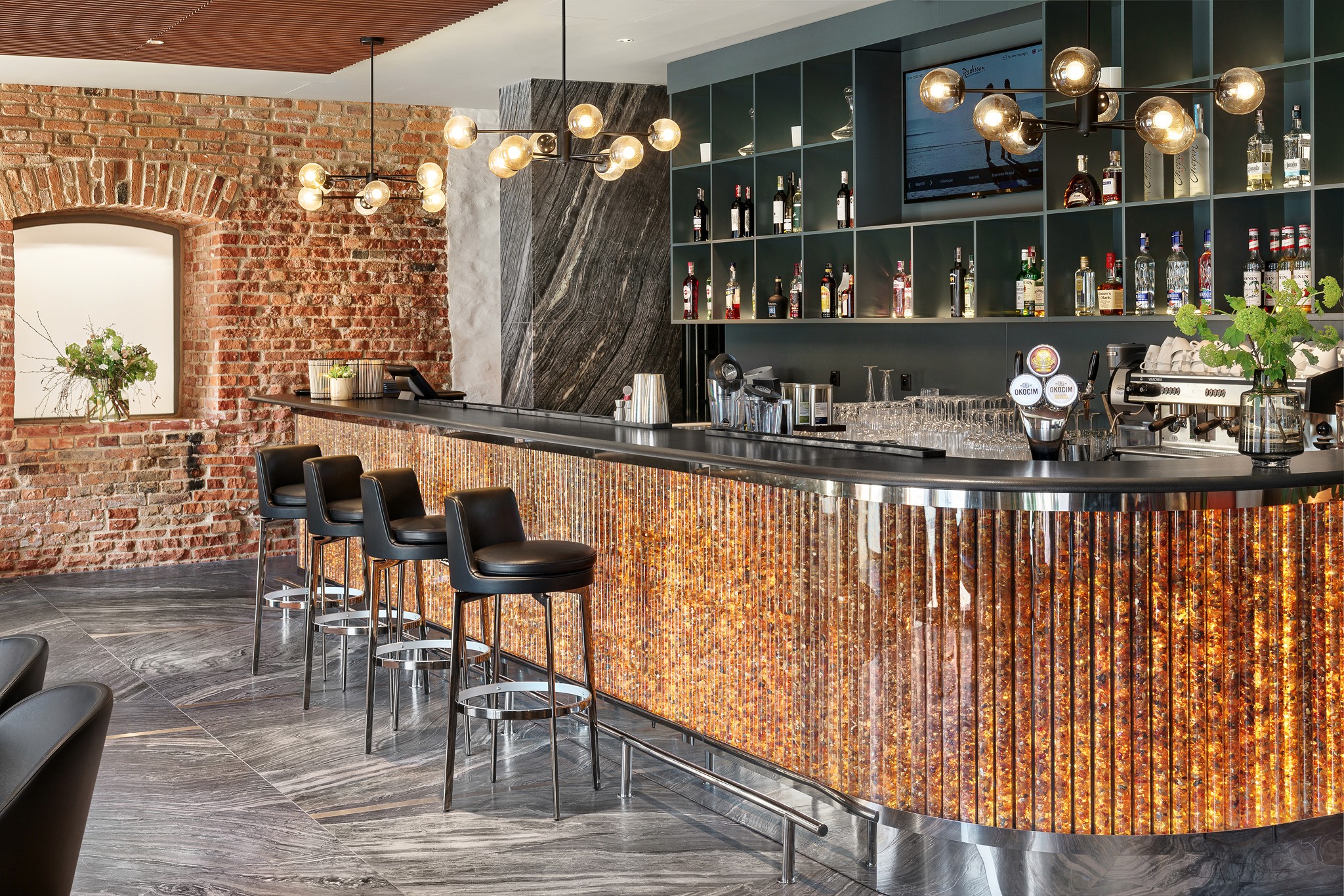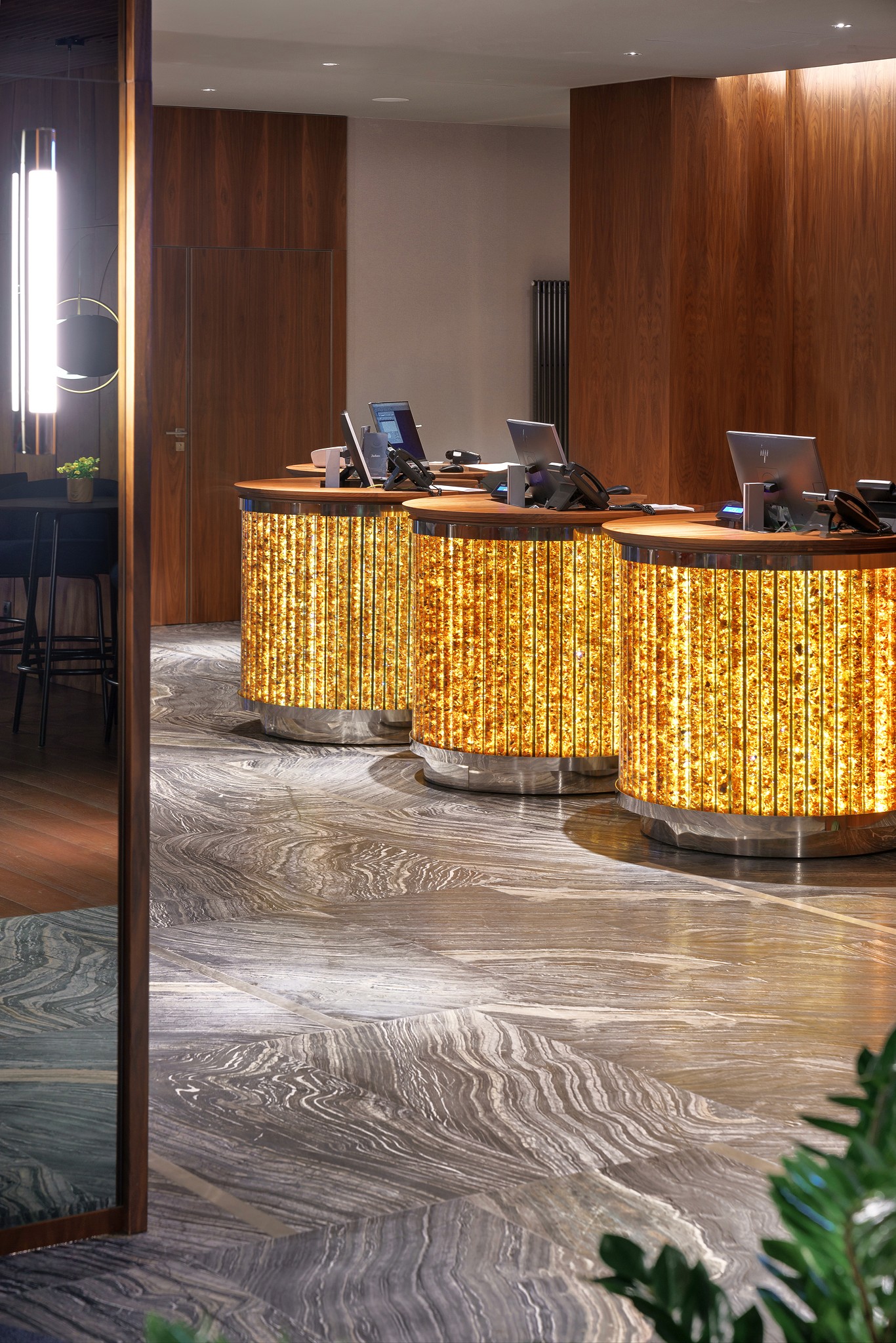 Lady recepcji oraz baru zostały wykonane z przezroczystych podświetlonych tub wypełnionych naturalnym bałtyckim bursztynem. To efektowe rozwiązanie zapada w pamięć.